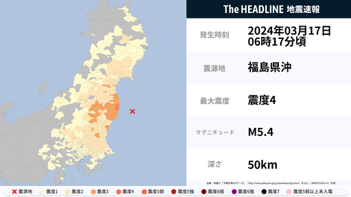3月17日6時17分頃、福島県で最大震度4の地震を観測