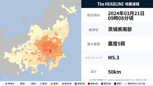 3月21日9時8分頃、栃木県・埼玉県で最大震度5弱の地震を観測