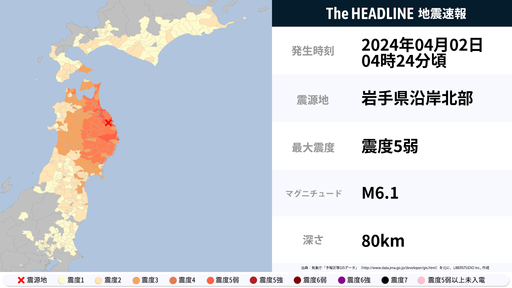 4月2日4時24分頃、青森県・岩手県で最大震度5弱の地震を観測