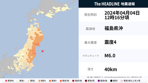 4月4日12時16分頃、岩手県・宮城県などで最大震度4の地震を観測