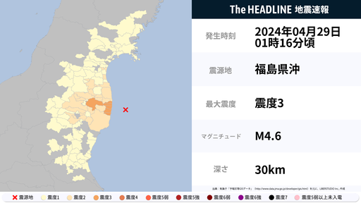 4月29日1時16分頃、福島県で最大震度3の地震を観測