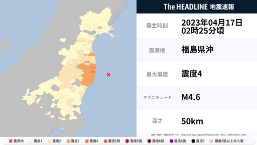 4月17日2時25分頃、福島県で最大震度4の地震を観測