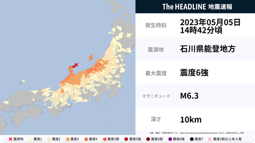 5月5日14時42分頃、石川県で最大震度6強の地震を観測