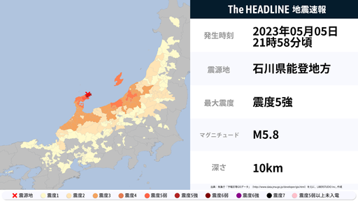 5月5日21時58分頃、石川県で最大震度5強の地震を観測