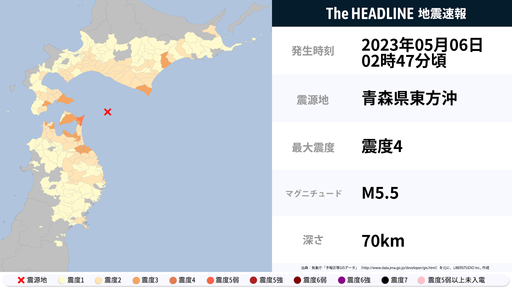 5月6日2時47分頃、青森県で最大震度4の地震を観測