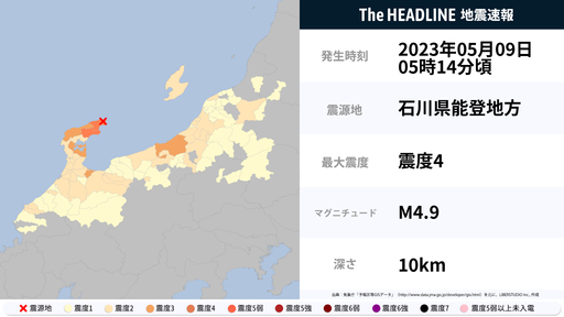 5月9日5時14分頃、石川県で最大震度4の地震を観測