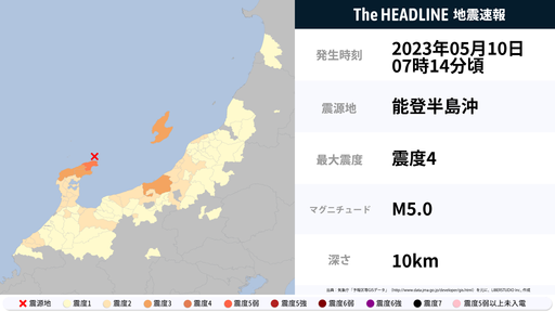 5月10日7時14分頃、石川県で最大震度4の地震を観測