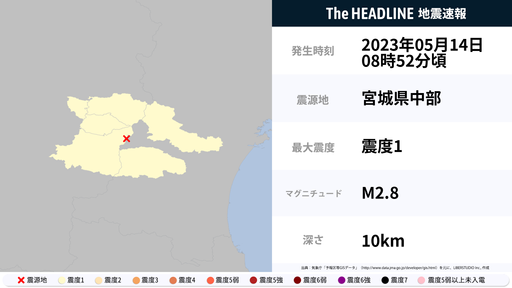 5月14日8時52分頃、宮城県・山形県で最大震度1の地震を観測