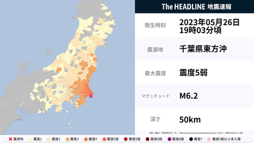 5月26日19時3分頃、茨城県・千葉県で最大震度5弱の地震を観測