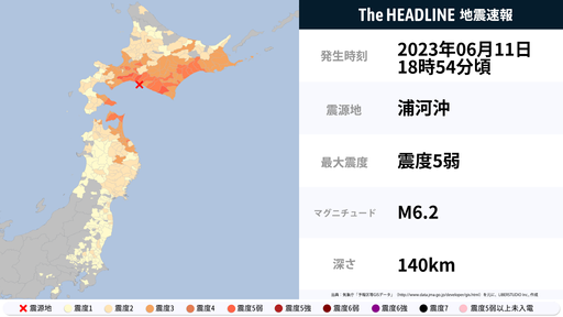 6月11日18時55分頃、北海道で最大震度5弱の地震を観測