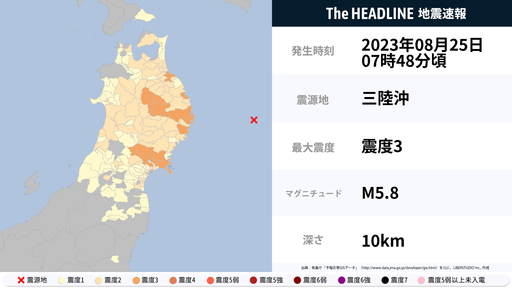 8月25日7時48分頃、青森県・岩手県などで最大震度3の地震を観測