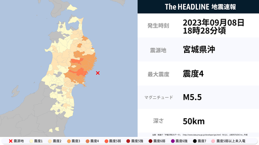 9月8日18時28分頃、岩手県・宮城県で最大震度4の地震を観測
