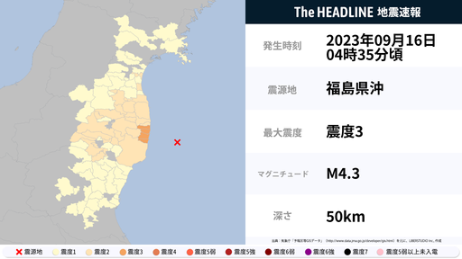9月16日4時36分頃、福島県で最大震度3の地震を観測