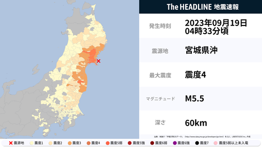 9月19日4時33分頃、岩手県・宮城県などで最大震度4の地震を観測