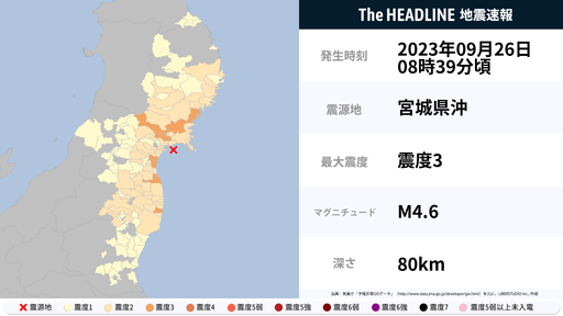 9月26日8時39分頃、宮城県・福島県で最大震度3の地震を観測