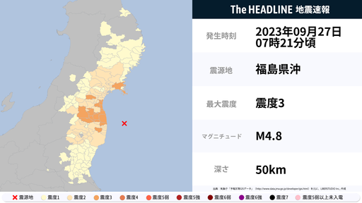 9月27日7時21分頃、宮城県・福島県で最大震度3の地震を観測