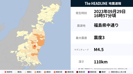 9月29日16時58分頃、福島県・茨城県で最大震度3の地震を観測