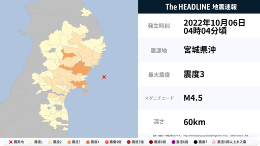 10月6日4時4分頃、岩手県・宮城県で最大震度3の地震を観測