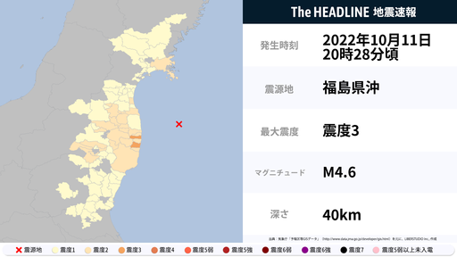 10月11日20時28分頃、福島県で最大震度3の地震を観測