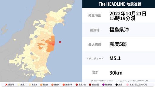 10月21日15時19分頃、福島県で最大震度5弱の地震を観測