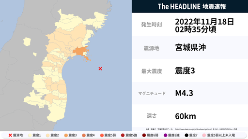 11月18日2時35分頃、宮城県で最大震度3の地震を観測