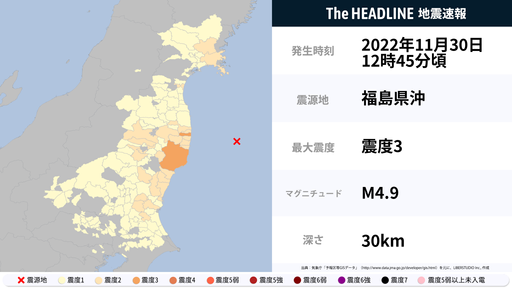 11月30日12時46分頃、福島県で最大震度3の地震を観測