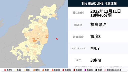 12月11日18時46分頃、福島県で最大震度3の地震を観測