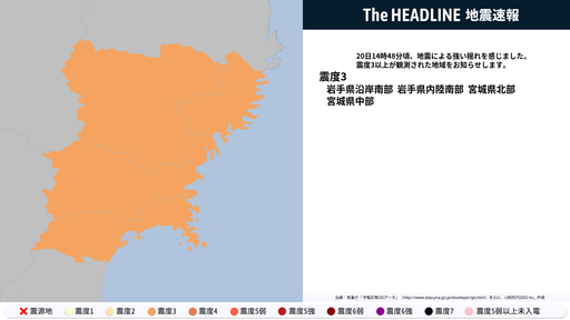 1月20日14時48分頃、岩手県・宮城県で震度3以上の地震を観測