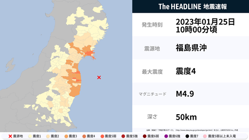 1月25日10時1分頃、宮城県・福島県で最大震度4の地震を観測
