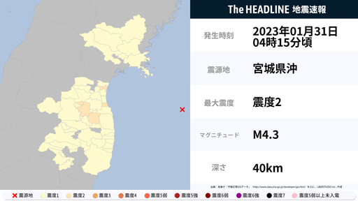 1月31日4時15分頃、宮城県・福島県で最大震度2の地震を観測