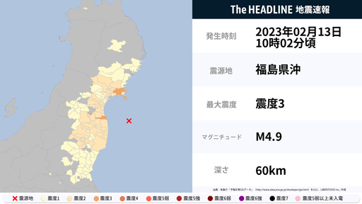 2月13日10時2分頃、宮城県・福島県で最大震度3の地震を観測