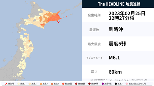 2月25日22時27分頃、北海道で最大震度5弱の地震を観測