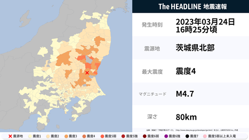 3月24日16時25分頃、福島県・茨城県などで最大震度4の地震を観測