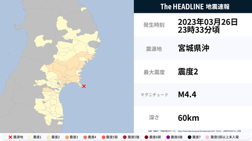 3月26日23時33分頃、岩手県・宮城県で最大震度2の地震を観測