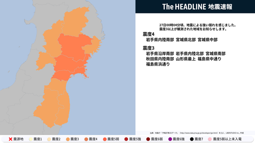 3月27日0時4分頃、岩手県・宮城県などで震度3以上の地震を観測