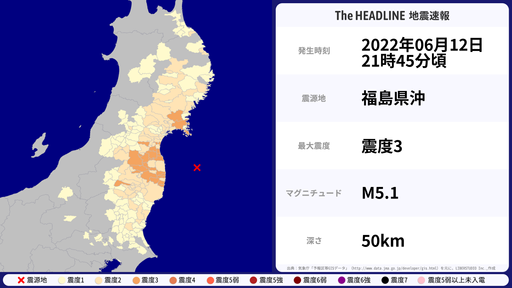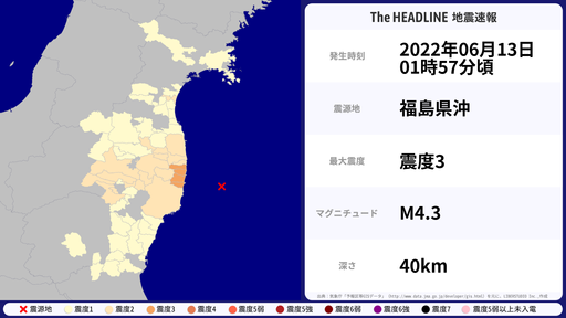 6月13日01時57分頃、福島県で最大震度3を観測する地震がありました。