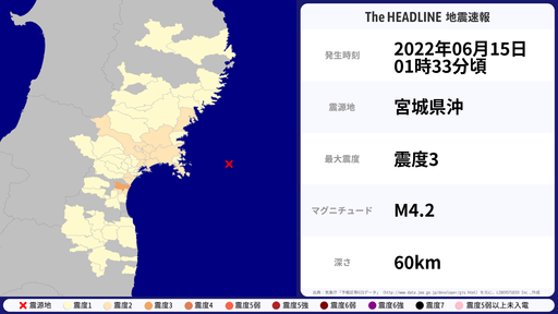6月15日01時33分頃、宮城県で最大震度3を観測する地震がありました。