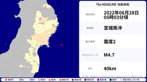 6月28日05時03分頃、岩手県などで最大震度2を観測する地震がありました。