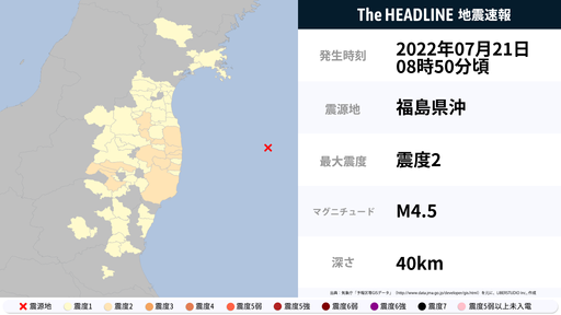 7月21日08時50分頃、福島県で最大震度2を観測する地震がありました。