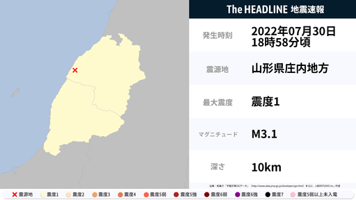 7月30日18時58分頃、山形県などで最大震度1を観測する地震がありました。