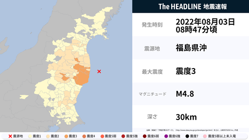 8月3日08時47分頃、福島県で最大震度3を観測する地震がありました。