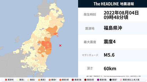 8月4日09時48分頃、宮城県などで最大震度4を観測する地震がありました。