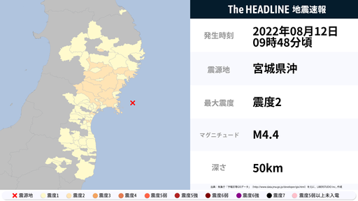 8月12日9時48分頃、岩手県・宮城県で最大震度2の地震を観測