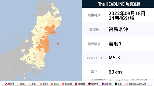 8月18日14時46分頃、宮城県・福島県で最大震度4の地震を観測