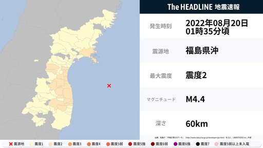 8月20日1時36分頃、宮城県・福島県で最大震度2の地震を観測