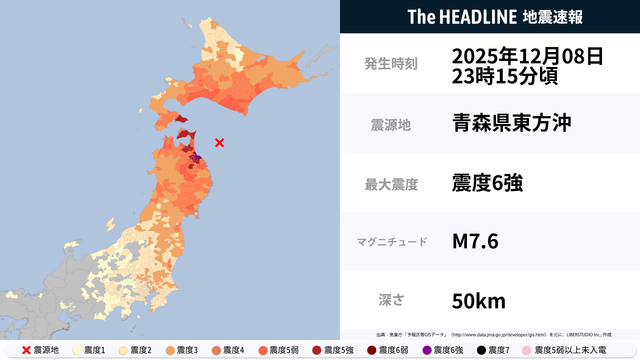 12月8日23時15分頃、青森県で最大震度6強の地震を観測