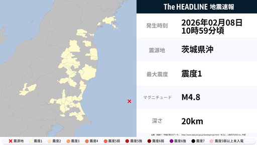 02月08日10時59分頃、茨城県沖を震源とするマグニチュード4.8の地震が観測された。最大震度1を観測したのは、宮城県・福島県など。