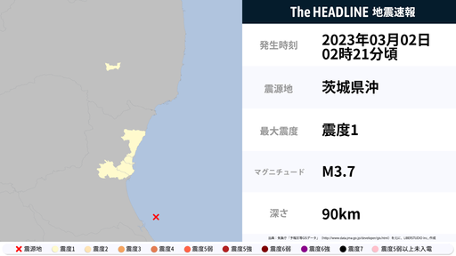 3月2日2時21分頃、福島県・茨城県で最大震度1の地震を観測