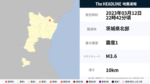 3月12日22時42分頃、福島県・茨城県で最大震度1の地震を観測