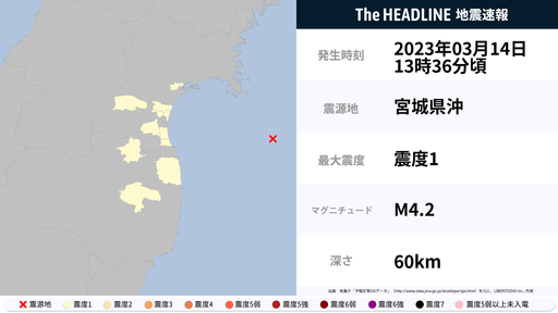3月14日13時36分頃、宮城県・福島県で最大震度1の地震を観測
